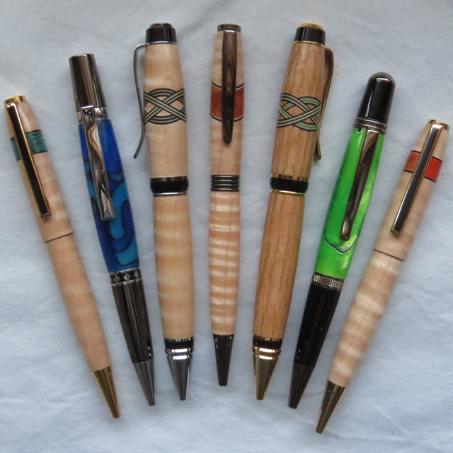 Explore the exciting art of pen turning through this hands‐on workshop, from simple to more advanced techniques. Experiment with wood glue‐ups and acrylics. Incorporate simple convenient jigs for cutting and gluing pen blanks. Use a lathe as a drill press and pen press. Use dry and wet sanding. Topics will include safety, operation of a lathe, tool selection and usage, mounting options, and finishing. Participants will have the opportunity to make a Celtic knot blank, and, turn a Slimline pen with matching keychain, a Celtic knot Sierra pen, and an acrylic Maple Leaf pen.